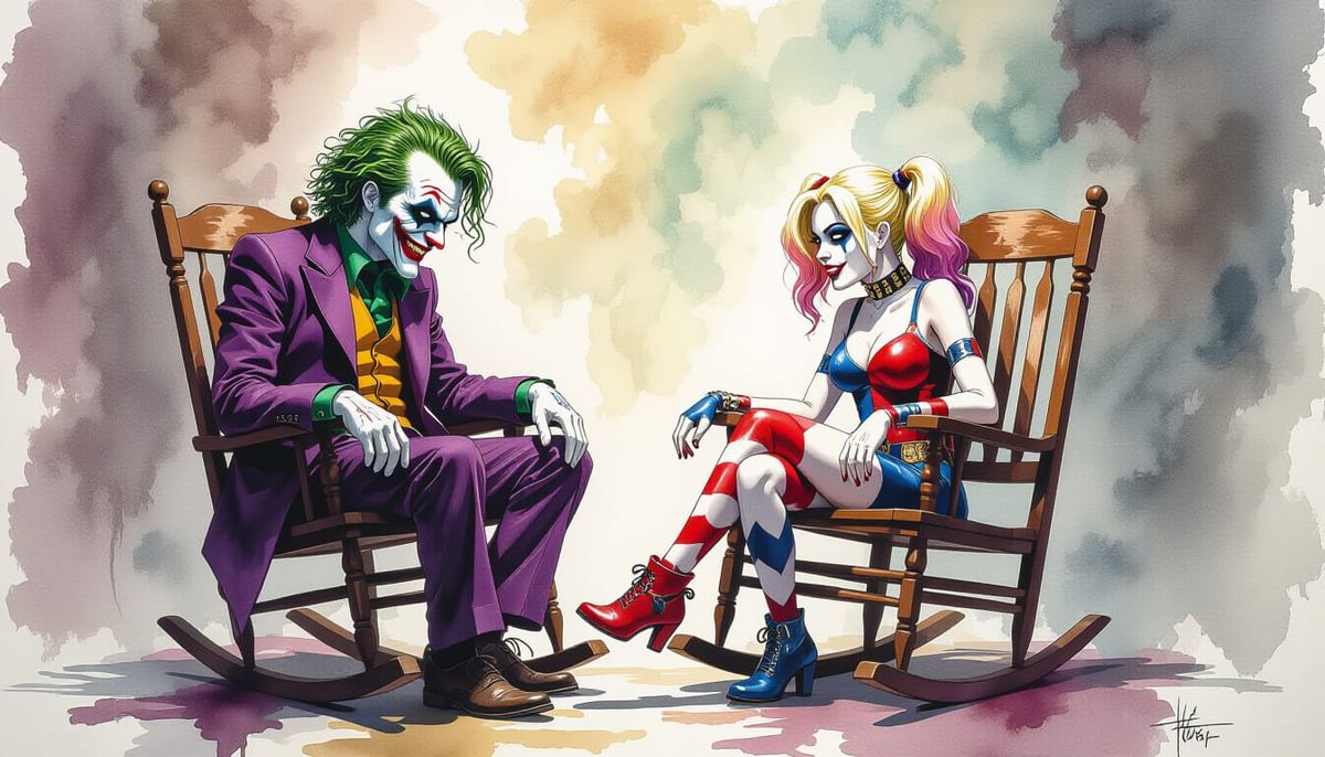A striking picture of The Joker facing Harley Quinn, relaxing in rocking chairs. This watercolor and alcohol ink painting features a dark, gritty aesthetic.