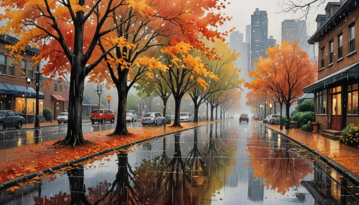 This image showcases a street scene rendered in a watercolor style, capturing the vibrant colors of autumn reflected in rainwater. The artwork evokes a thoughtful, moody atmosphere.