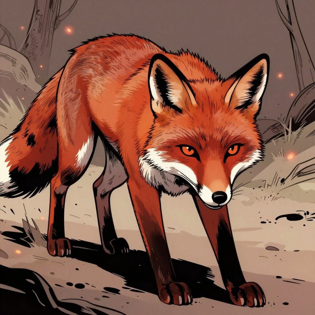 This image features a menacing fox viewed up close, creeping forward in a stylized art line drawing. Bold outlines and stark shadows create a predatory aura, with a limited palette of earth tones and red.