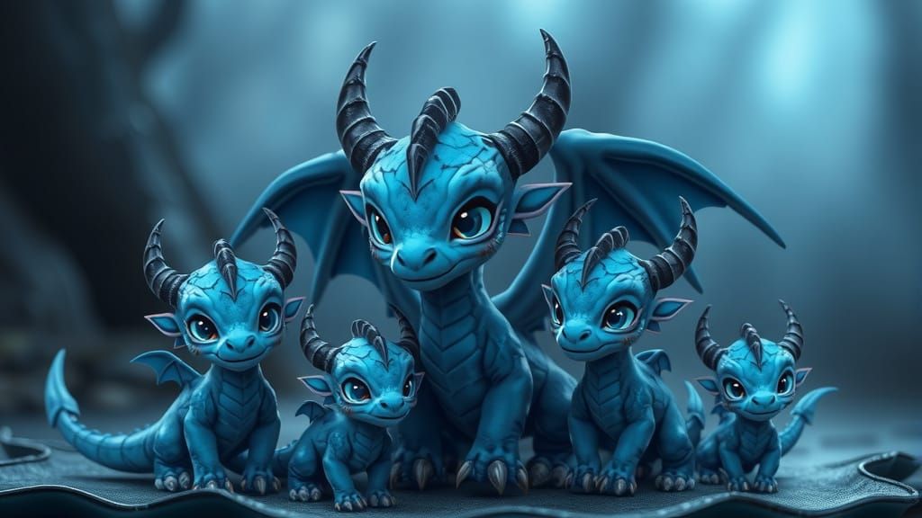 This image shows a family of adorable blue chibi dragons in a fantasy setting, featuring intricate details and a unique gothic aesthetic.
