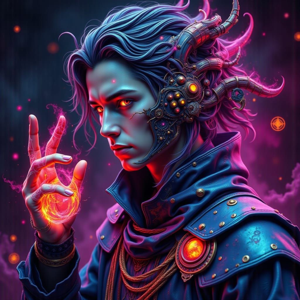 This highly detailed image showcases a wizard with a futuristic computer implant integrated into the side of their head. The artwork features vibrant colors and a cybermysticpunk aesthetic, rendered in high definition.
