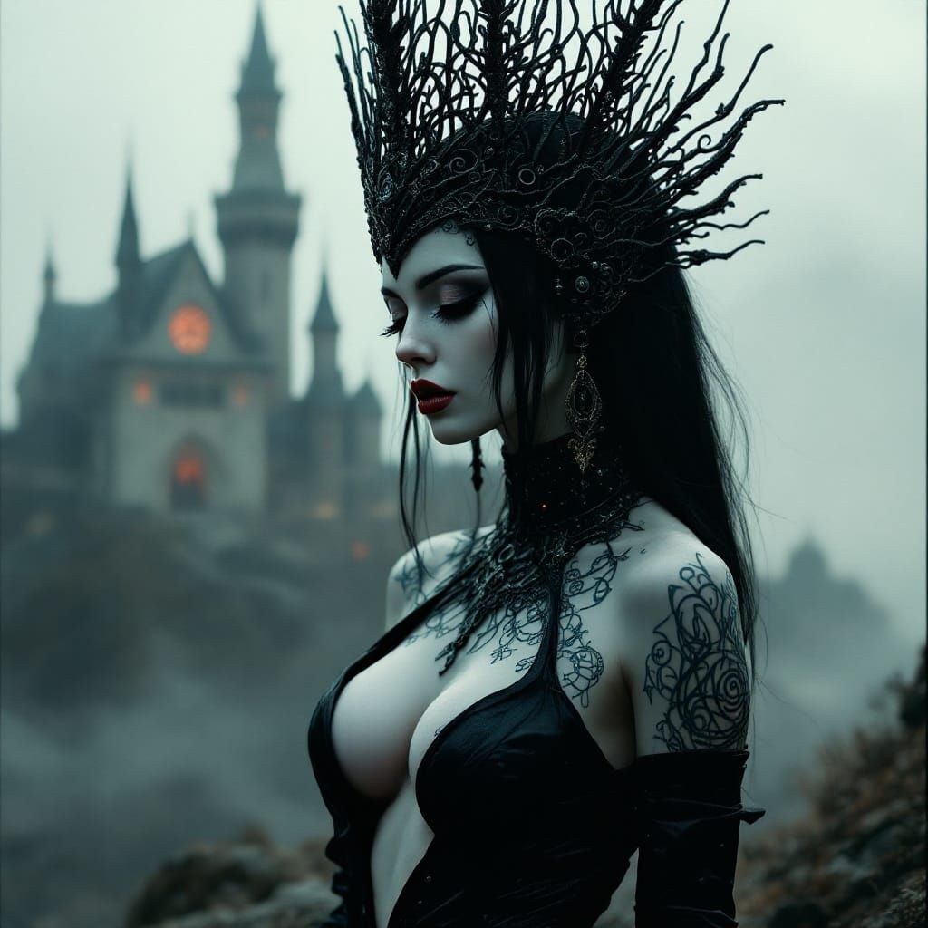 This image shows a surreal gothic woman with pale skin and a dark crown, set against a mist-shrouded castle. The artwork features dramatic lighting and a dark romantic aesthetic.