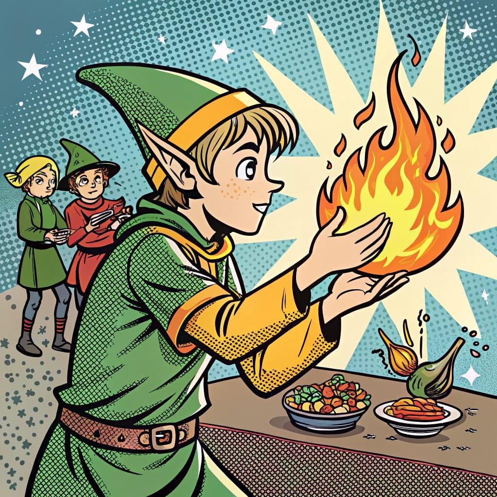 This image depicts a young elf mage conjuring a fireball for acolytes preparing dinner. The artwork is rendered in a vibrant pop art style.