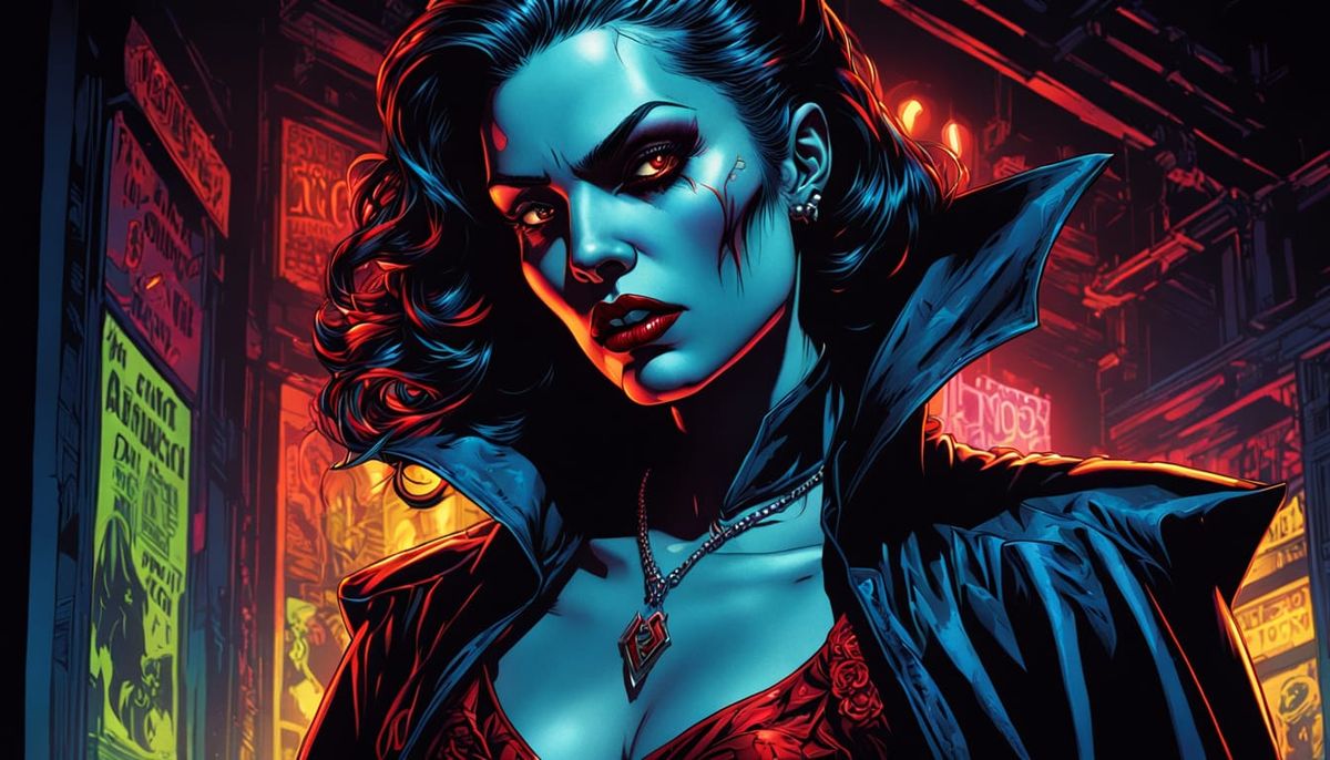 This image shows a confident vampire woman in a Yakuza-style outfit. The digital painting features vibrant tattoos, neon light reflections, and a dynamic contrast of shadows and bright colors, rendered as comic book art.