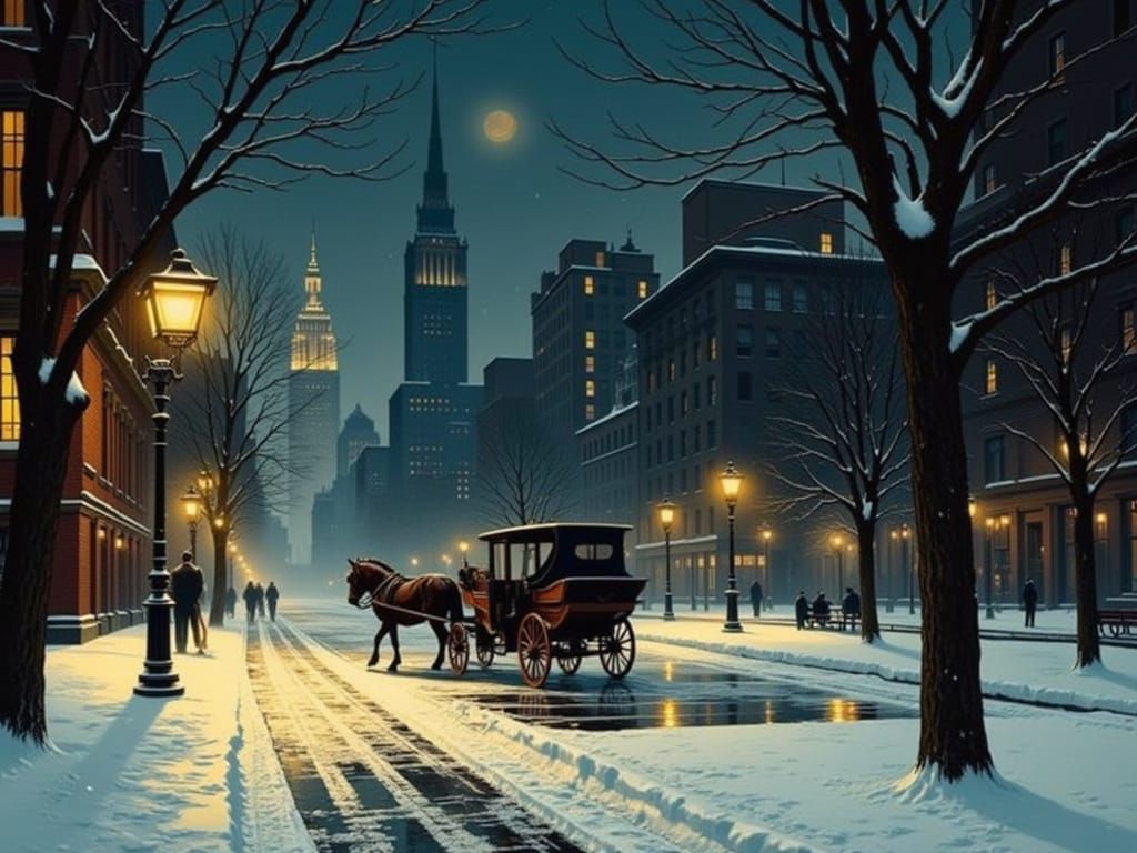 A moody, vintage oil painting shows a horse-drawn carriage in a snowy city park at night. Golden street lamps illuminate the scene, with misty skyscrapers in the background.