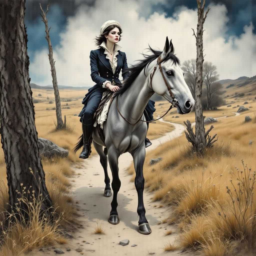 This image shows a woman riding a horse through a stormy landscape, captured in a moody surrealist art style reminiscent of Prudhon and Degas' charcoal works.