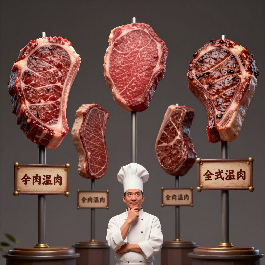 This image shows a small chef looking up at tall posts holding various steaks, each cooked to a different temperature. Rendered in a detailed matte painting style with deep, complementary colors.