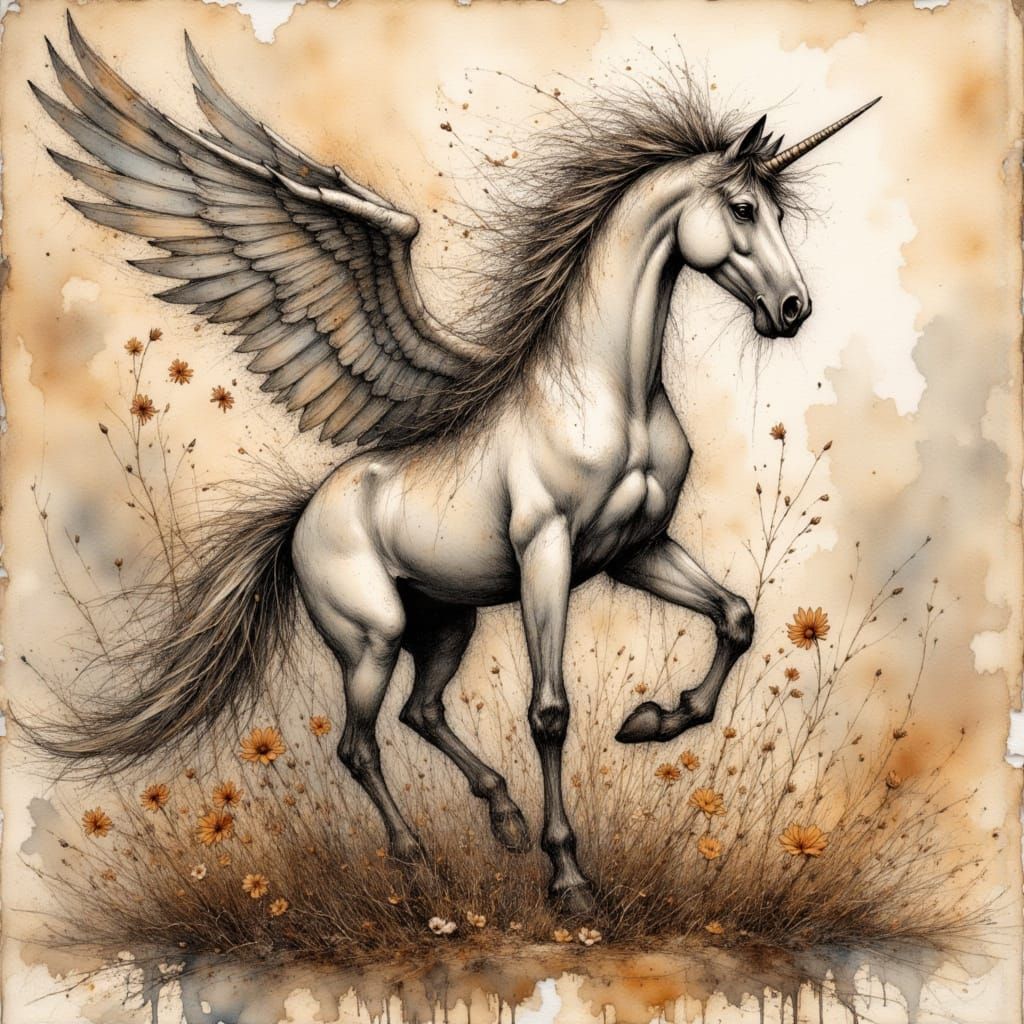 This image shows a felt Pegasus posing for a photograph. The artwork is created in an impasto style with textures reminiscent of oil paintings, and crosshatching ink line art.