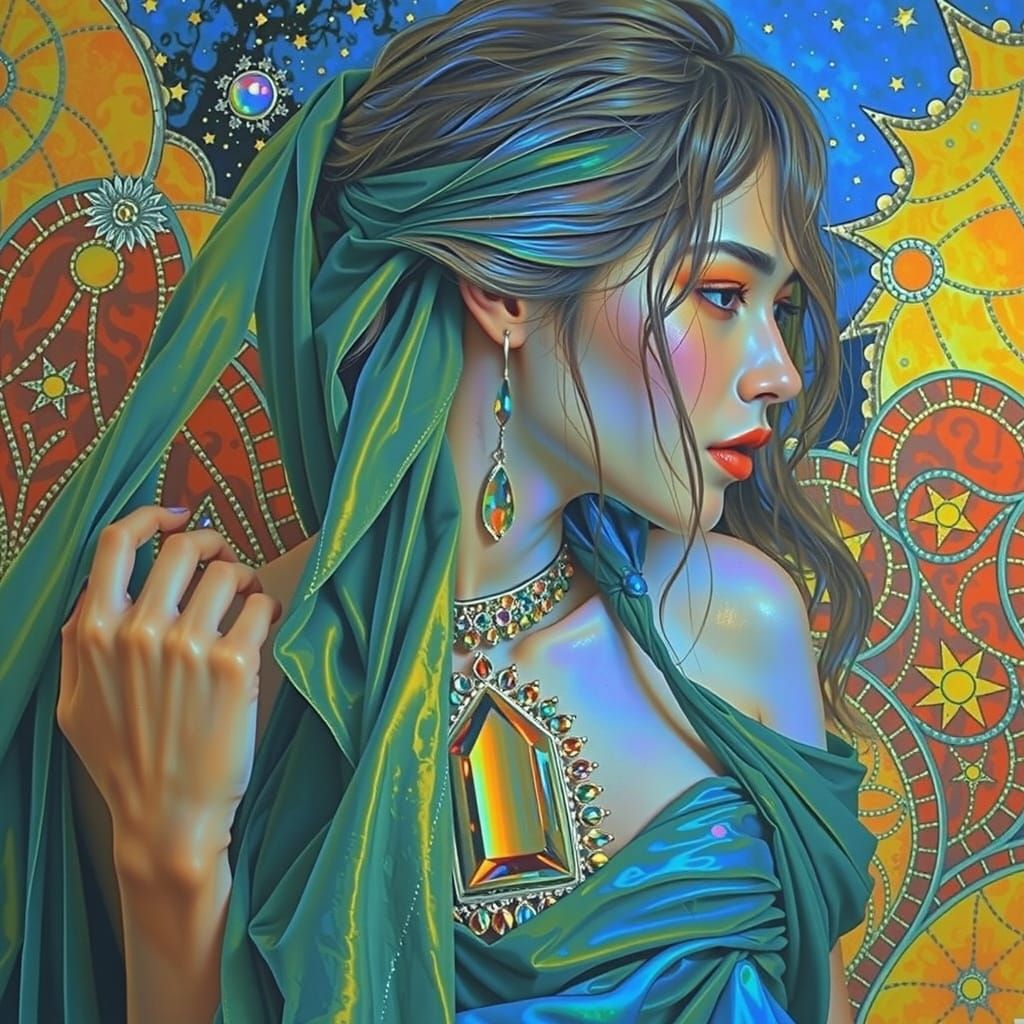 A striking picture of a woman with iridescent skin and a jeweled gown, set against a starry night. The artwork exhibits a maximalist style reminiscent of mosaic art and golden ornamentation.