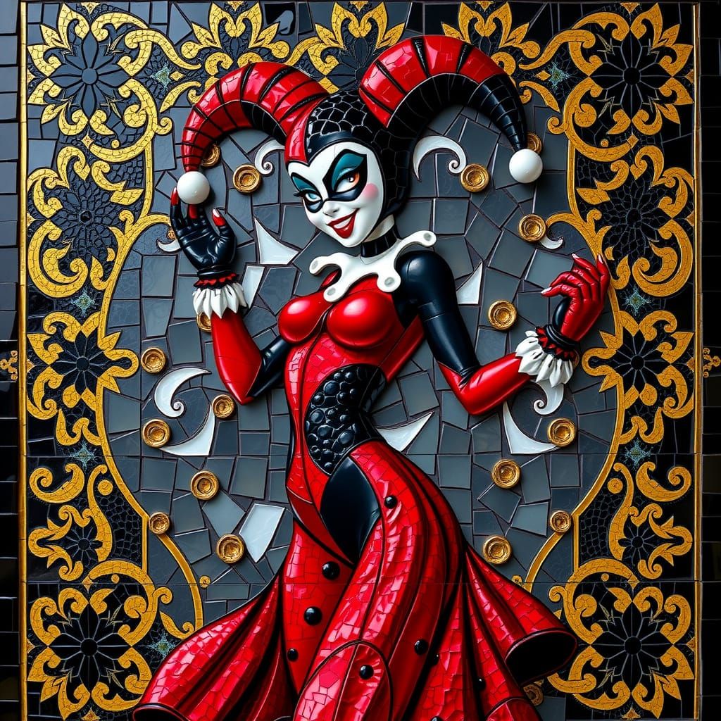 Easily generate your own unique mosaics, like this stunning Harley Quinn piece, with our free AI image creator