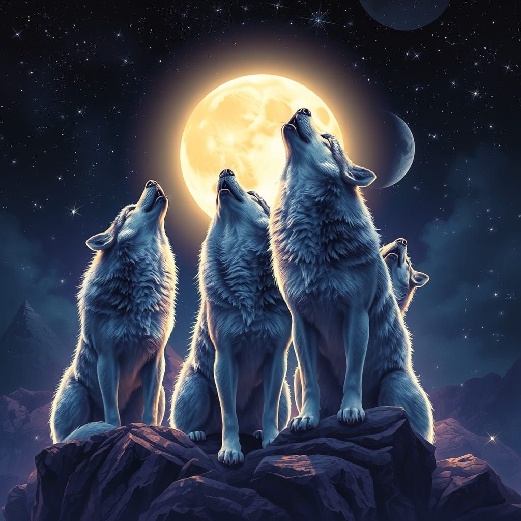 This image depicts a wolf pack howling at a full moon. The cosmic illustration is rendered in mixed media with an astral holographic aesthetic.