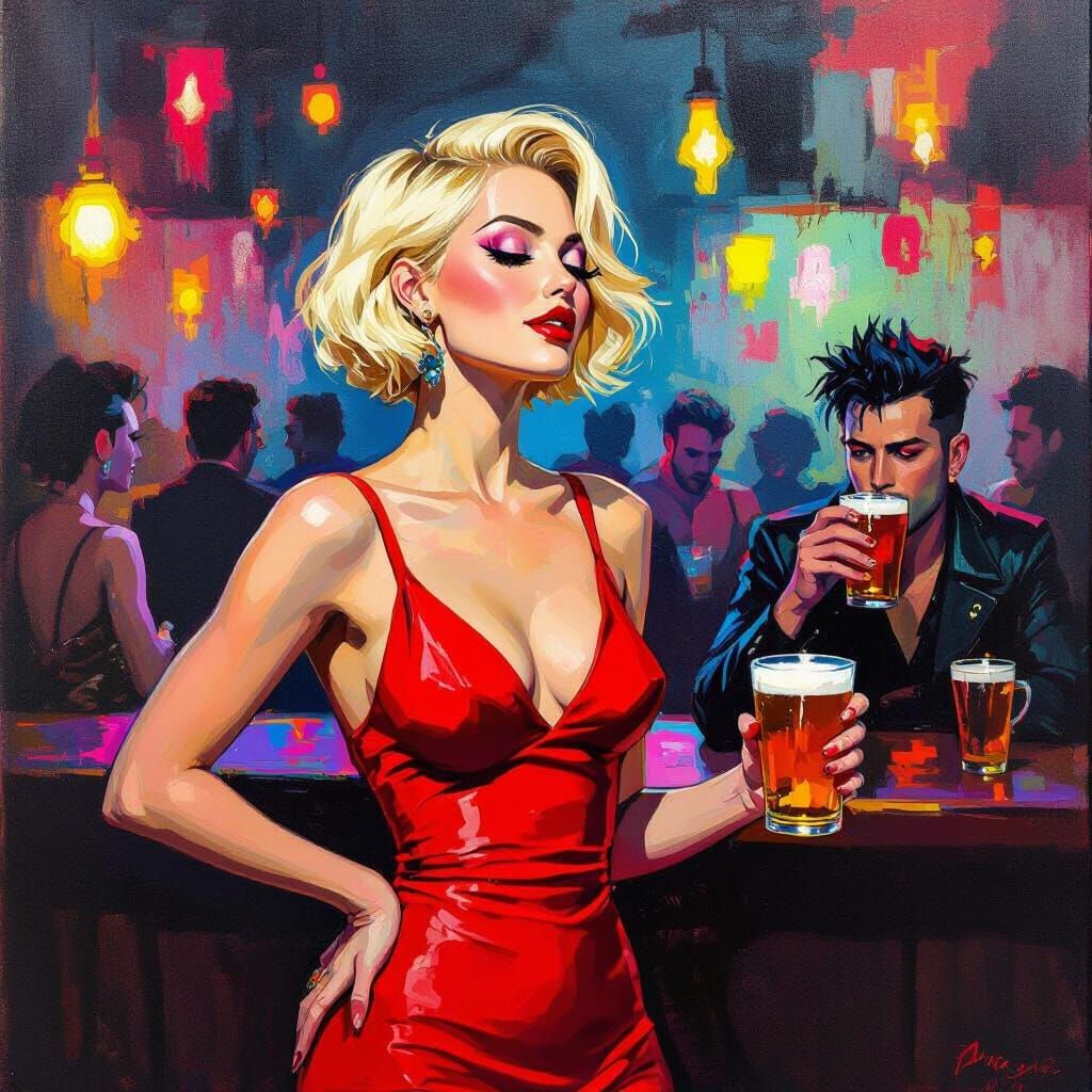 This image depicts a blonde trans woman in a red dress dancing in a gay bar, observing a punk enjoying a beer. The artwork evokes an art deco style with vibrant colors and expressive brushstrokes.