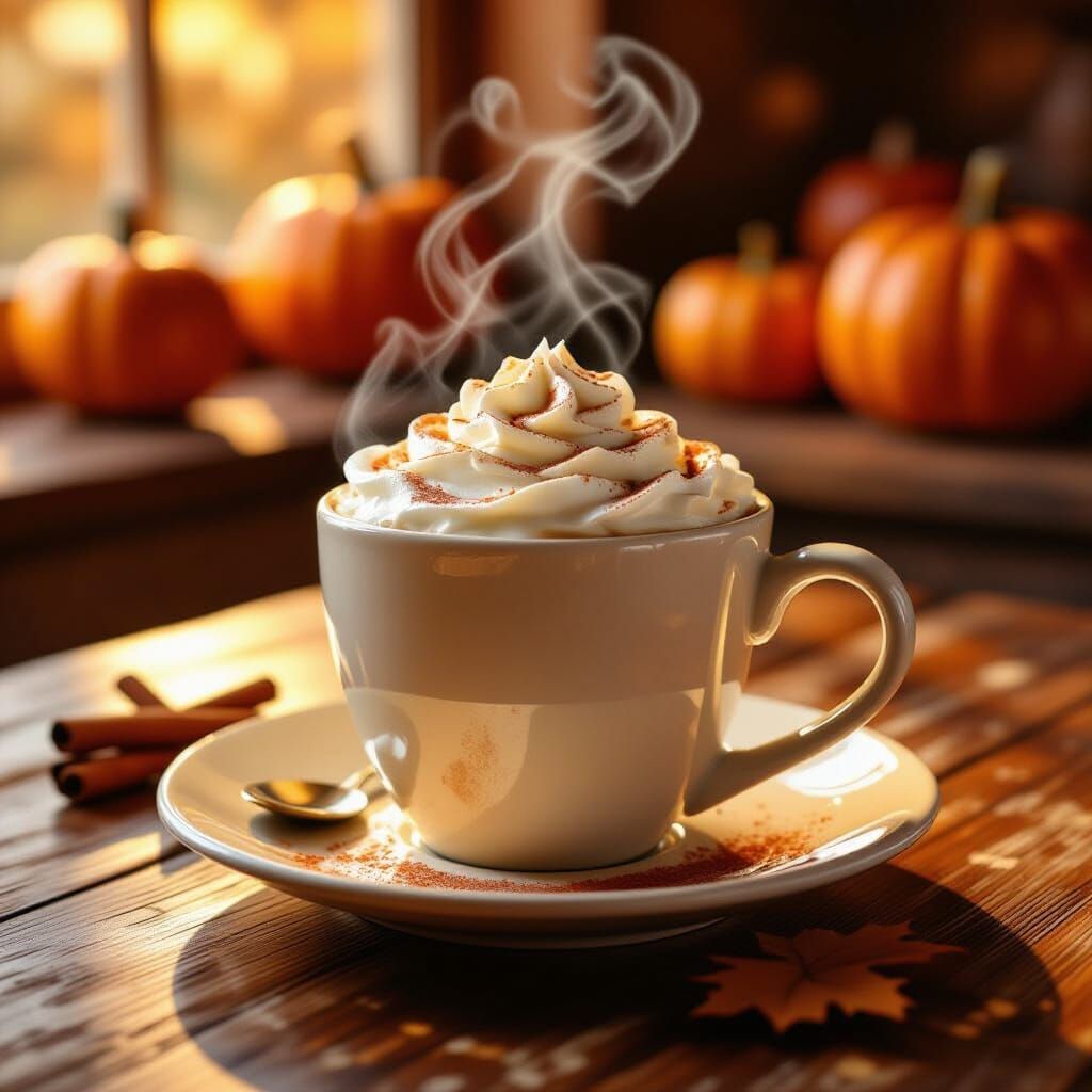 A steaming mug of pumpkin spice cappuccino with whipped cream, presented on a rustic table. This image evokes a warm, cozy autumn atmosphere with rich, textured oil painting techniques and cinematic lighting.