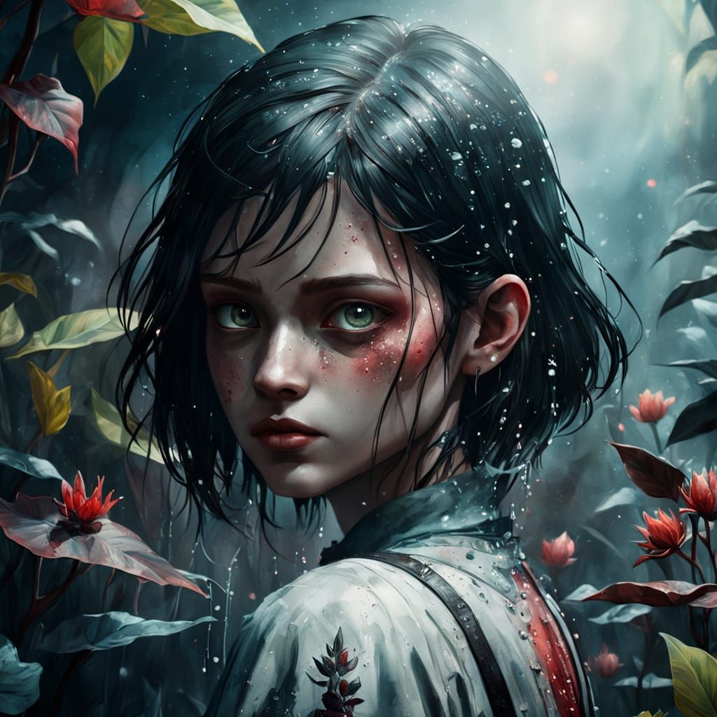This haunting image depicts a young girl surrounded by a mystical, multi-level botanical composition, evoking the eerie atmosphere of a Hieronymus Bosch painting. Dominant red and black hues, velvet textures, and soft, eerie lighting create a sense of deep fantasy and mysticism.
