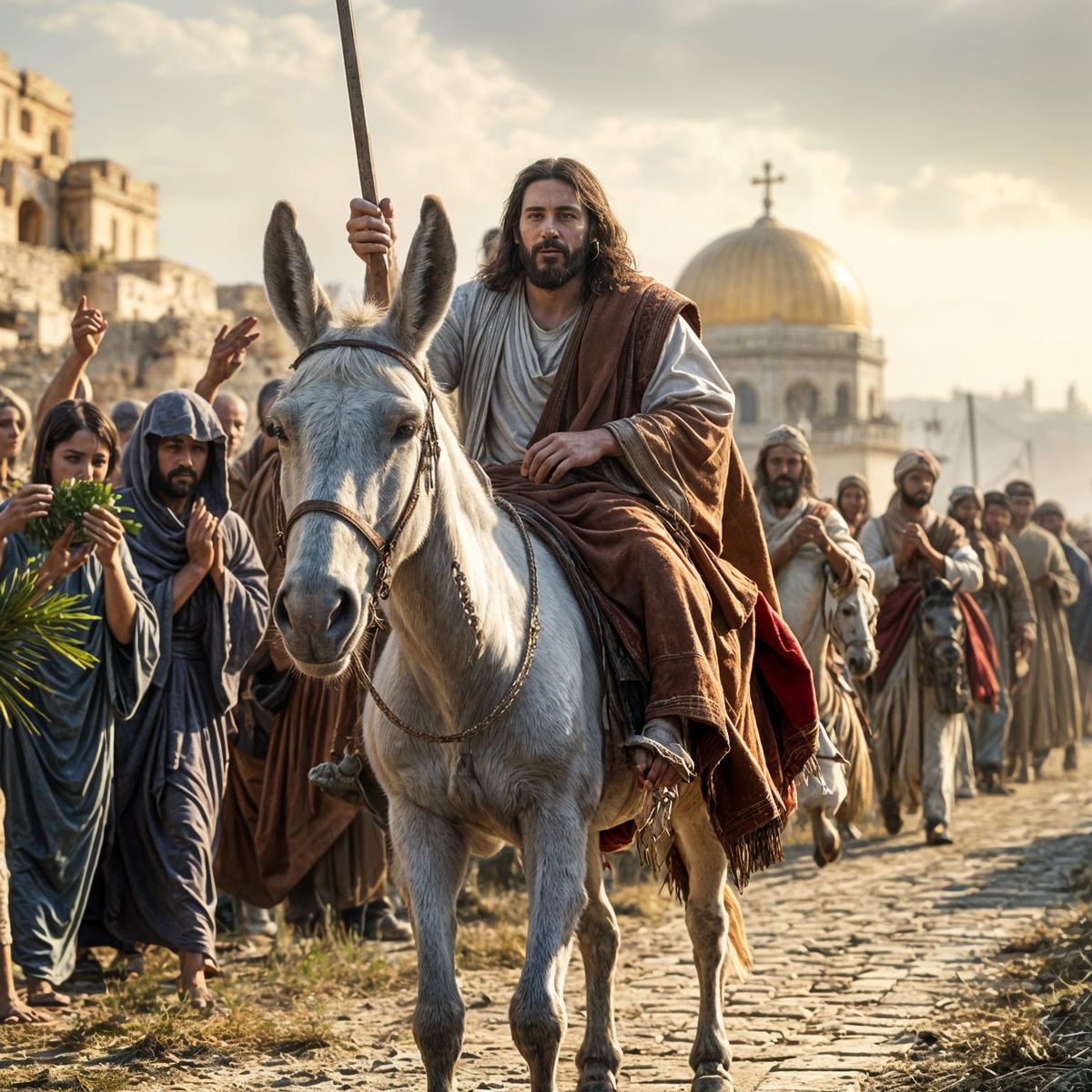 Easily create your own Christian art with our free AI image generator, featuring iconic scenes like Jesus' entry into Jerusalem.