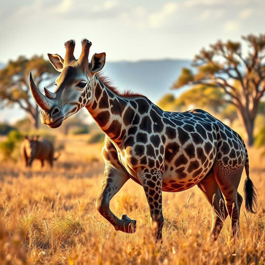 This image captures a striking blend of a giraffe and rhinoceros in a vibrant savannah landscape, featuring warm golden light, shallow depth of field, and atmospheric haze, in a style reminiscent of wildlife photography and fantasy illustration.