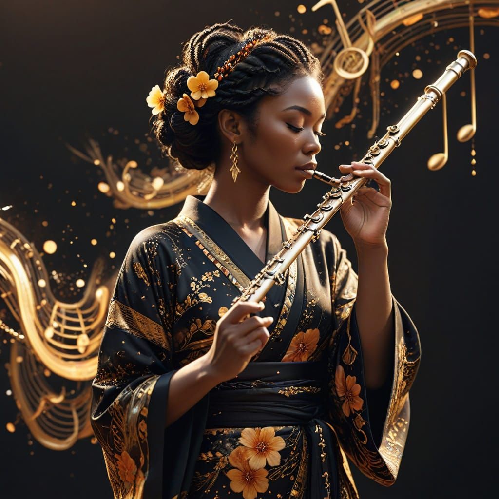 BLACK WOMAN WITH BRAIDED HAIR DRESSED IN A BLACK FLORAL DESIGN KIMONO PLAYING A SILVER FLUTE COVERED IN MUSICAL NOTES ON A BLACK AND GOLD MUSICAL NOTE BACKGROUND.