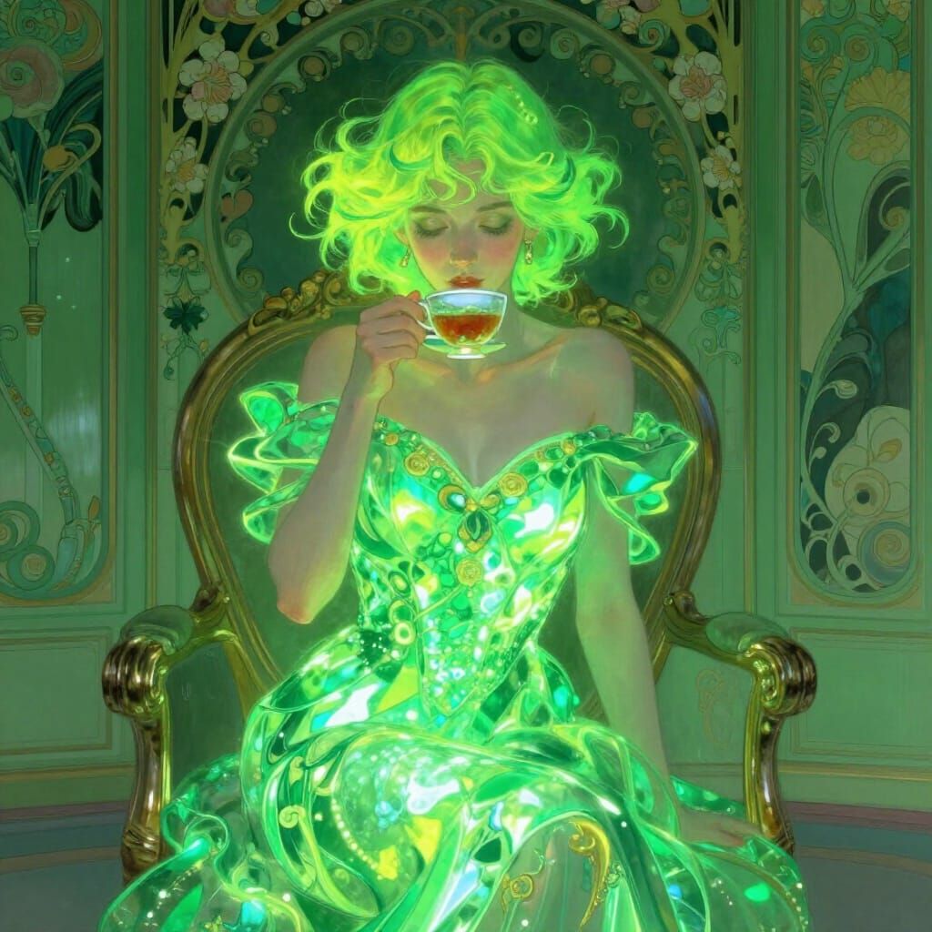 This image features a woman with glowing green hair and dress in an ornate green room with floral patterns. Rendered in a digital matte painting style with vivid colors.