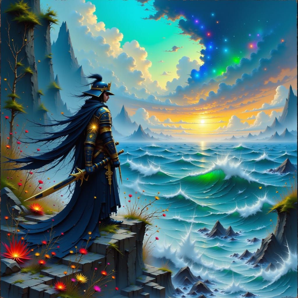 This image shows a solitary samurai warrior on a cliff, gazing over a tempestuous sea. The artwork features smooth gradients, vibrant colors, and celestial armor details, reminiscent of ethereal airbrush art.