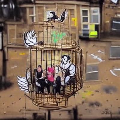 This image depicts six figures confined within a birdcage, presented as street art. The style is reminiscent of stencil graffiti, with stark contrasts and social commentary.