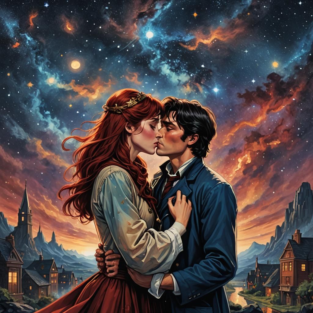 A digital painting of a couple cosplaying as characters from the Jumanji movies, sharing a kiss. They are at a comic convention, with a starry night sky in the background, as concept art.