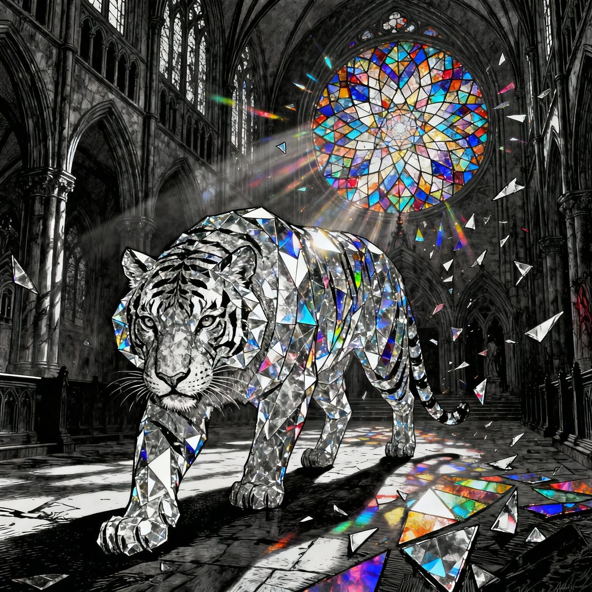 This detailed line art shows a crystal tiger in a disorienting church, with light scattering like shattered glass. Features dramatic lighting and deep shadows.