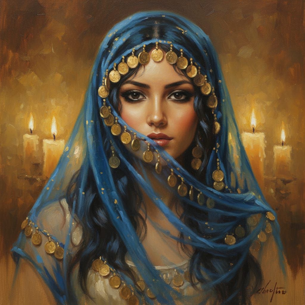 This masterpiece oil painting captures a beautiful Arabian girl veiled in coin-adorned chiffon, with kohl-lined eyes and dark hair, bathed in intricate candlelight detail.