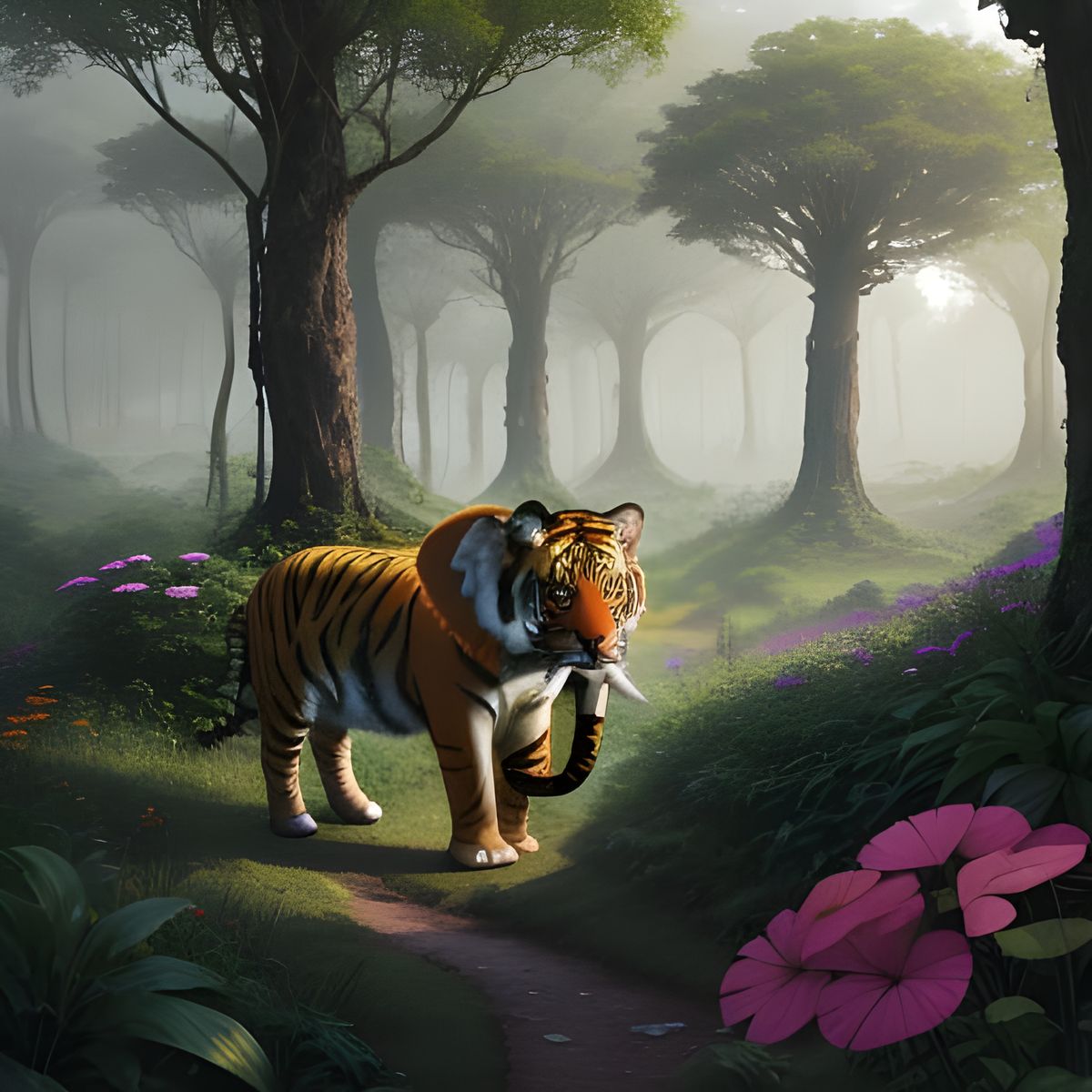 This detailed fantasy artwork depicts the imaginative offspring of an elephant and a tiger, showcasing intricate details and a palette of complementary colors, as seen in trending 8k resolution concept art.