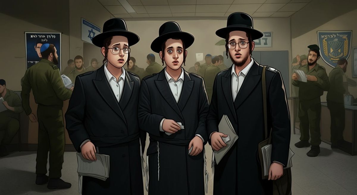 A poignant scene of three traditional Hasidic youths standing out at an Israeli army recruitment center, amidst Hebrew signs and military posters, with dramatic lighting and composition capturing their culture shock and apprehension, in a style reminiscent of realistic digital comic art.