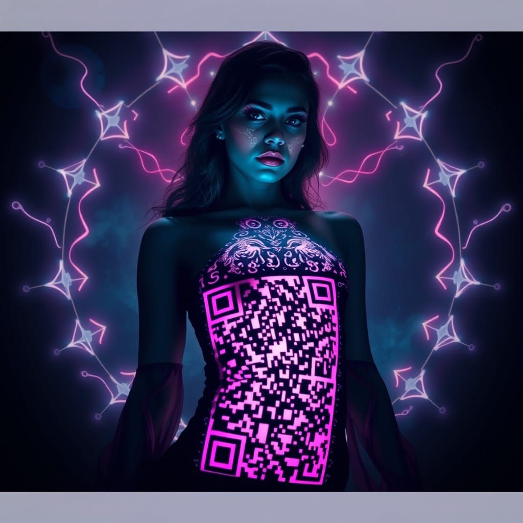 This image shows a woman standing in a starry night sky, surrounded by an aura of magical energy. She has a glowing QR code on her body, illuminated by flashes of light that highlight her dreamlike clothing. The artwork is inspired by dark and mysterious styles, with deep colors and intense shadows, evok...