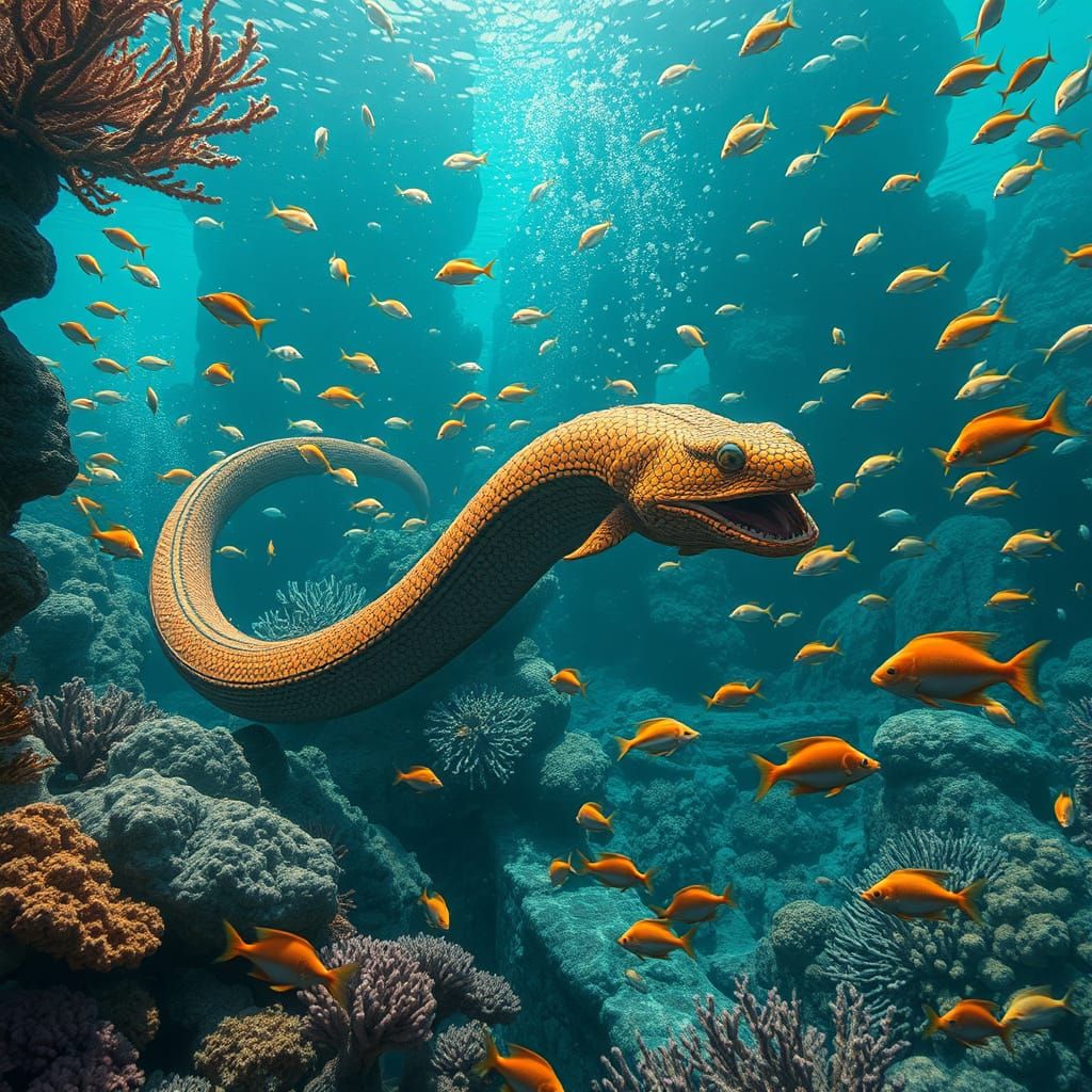 Fantastic sea serpent, in an interesting and amazing coral reef, abundant with fish and mysterious structures.