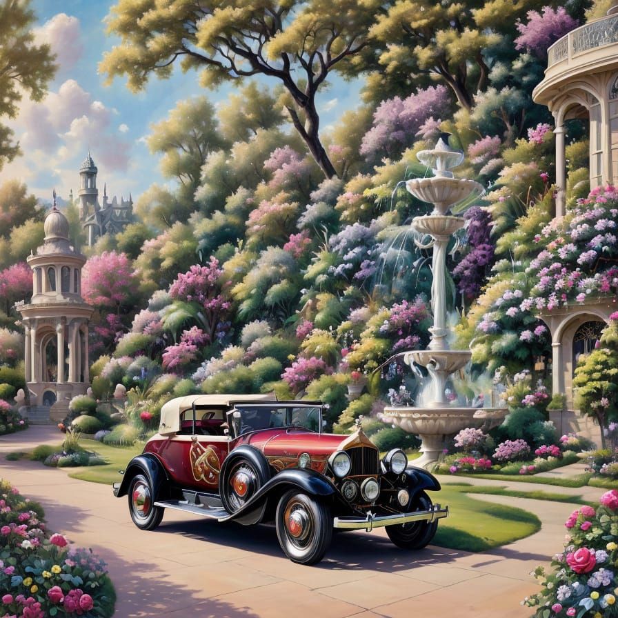 This Art Nouveau oil painting shows a woman in a stunning multicolored, butterfly-shaped glass dress. Set in a detailed Victorian garden with a classic car, it features soft, pastel colors and a dreamlike atmosphere.
