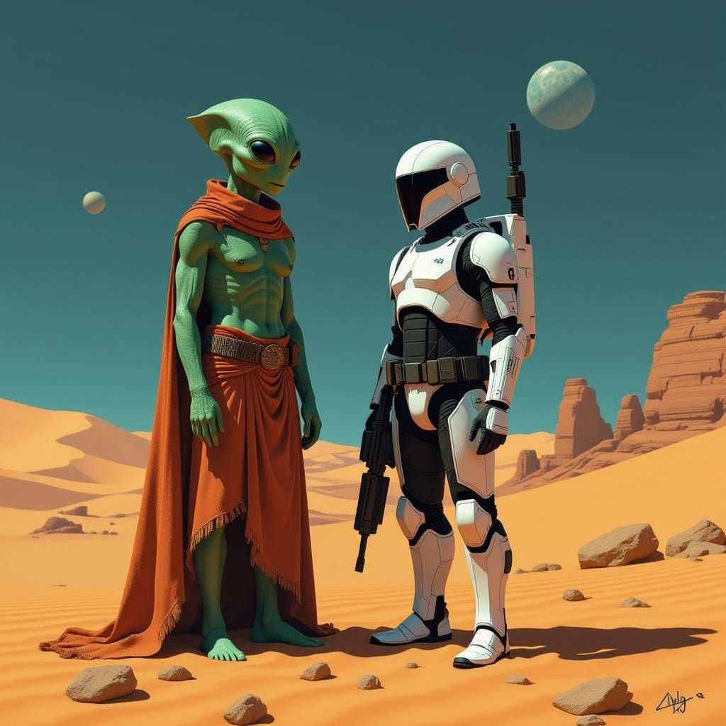 This image shows a humanoid alien and a human soldier standing on a desolate, desert-like planet, surrounded by sandy dunes and rocky outcrops, in a dark, sci-fi aesthetic reminiscent of industrial and dystopian art.