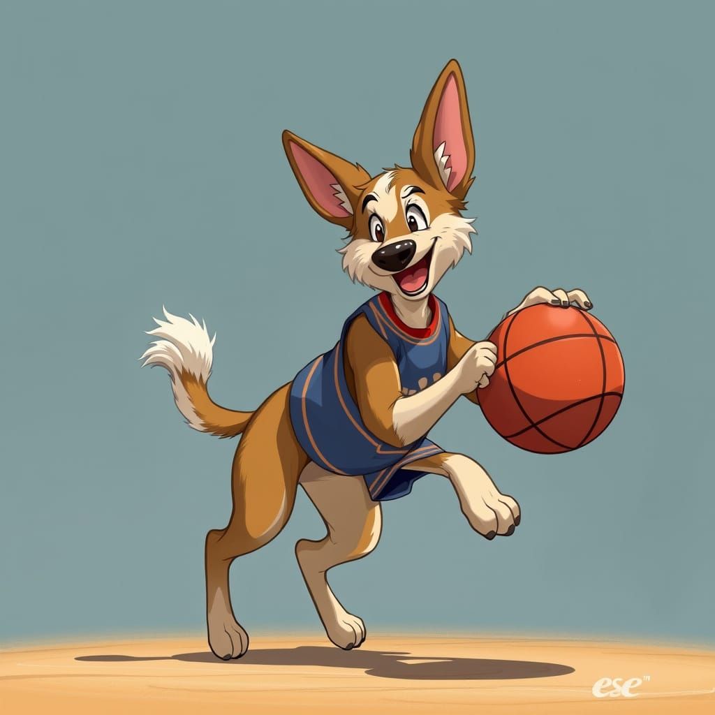 This image shows an anime-style dog playing basketball. The artwork features vibrant colors and dynamic action, capturing the energy of the game.
