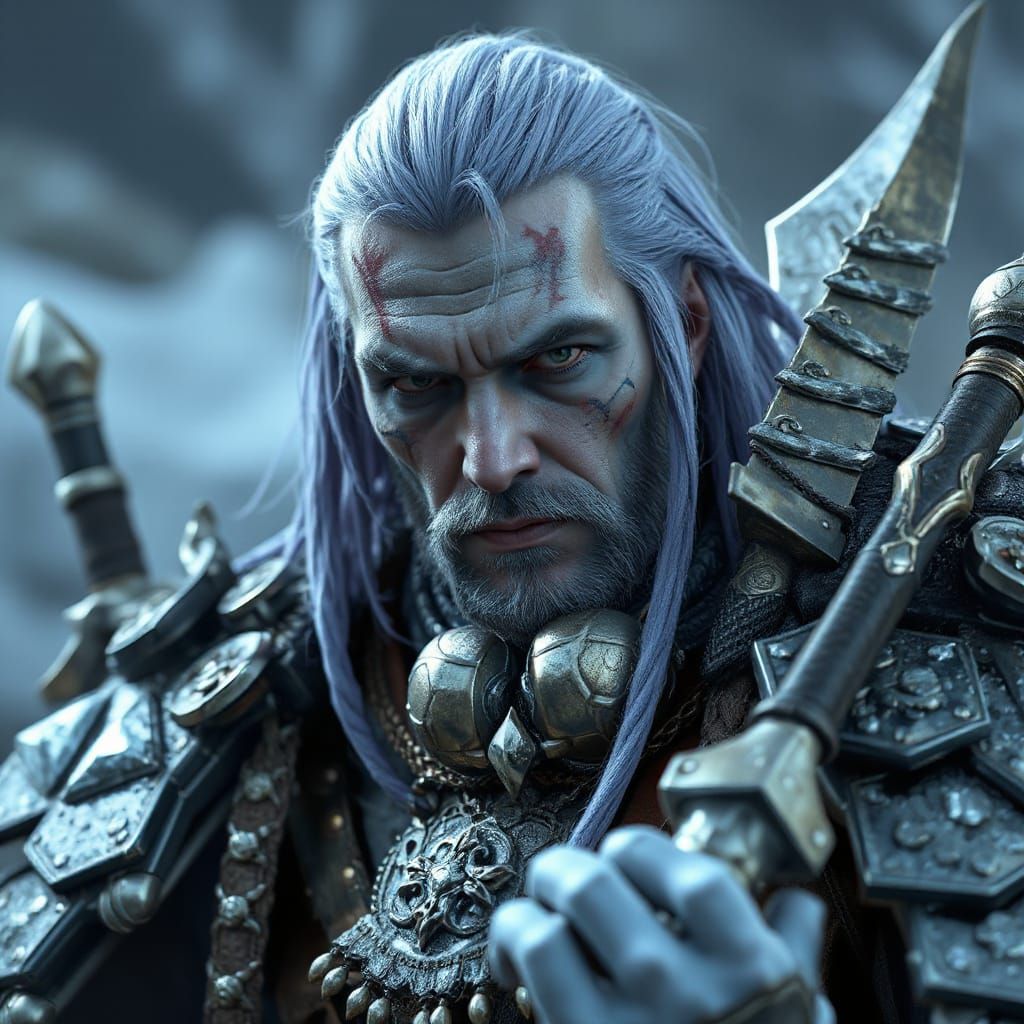 This stunning portrait showcases a majestic warrior with blue skin and lavender hair, adorned in intricate ice-inspired armor and wielding frosty weapons, set against a backdrop of dynamic triadic colors and volumetric lighting, reminiscent of fine Art Nouveau and concept art traditions.
