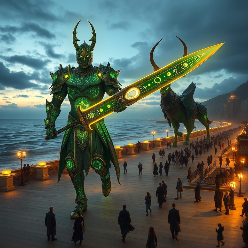 A breathtaking digital painting of a towering warrior and his majestic companion walking along a coastal path, surrounded by tiny onlookers and bathed in golden, dramatic light.
