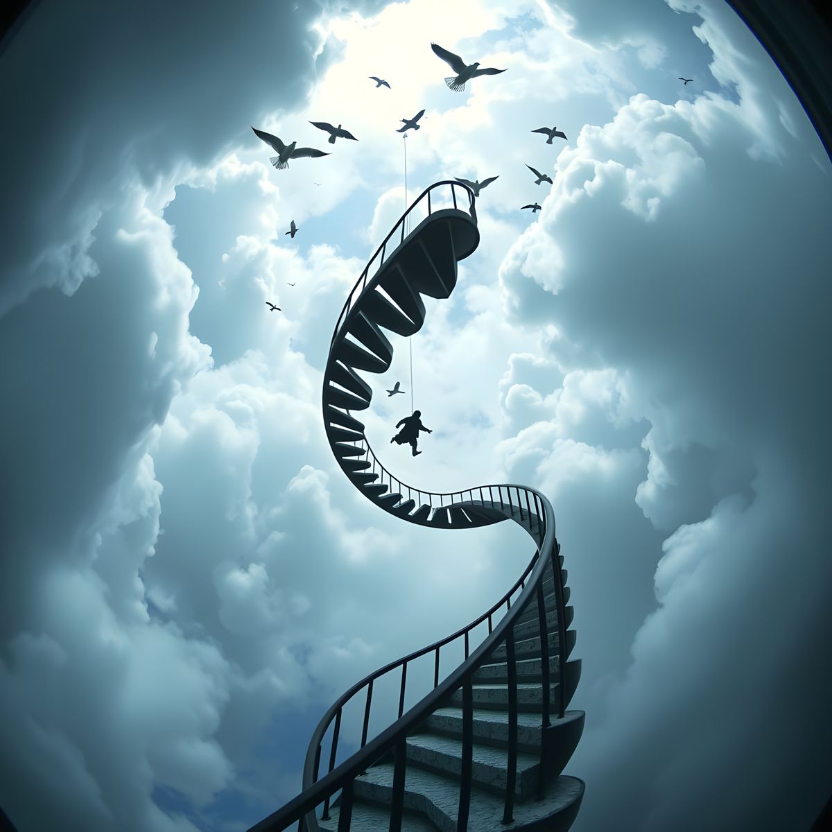 This image shows a surreal spiral staircase stretching into the sky. A lone figure descends as birds fly upwards, creating a sense of imbalance and drama. Rendered with cinematic lighting and a film grain effect.