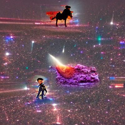 A digital rendering of a space cowboy riding a comet. The image captures the vastness of space as the comet hurtles towards the edge of the universe.