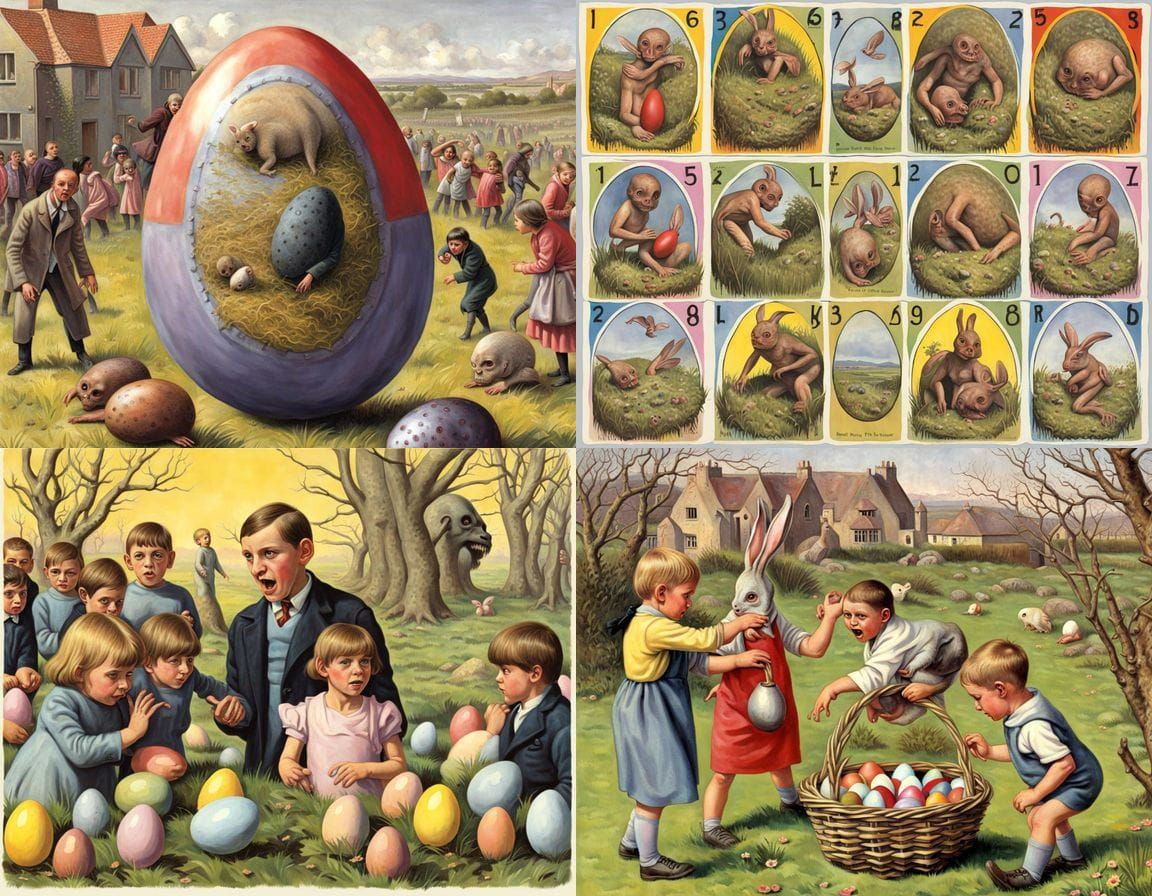 This image shows a disturbing yet charming Easter egg hunt scene in a surreal, Ladybird book-inspired style, blending innocence with dark, homunculus horror elements.