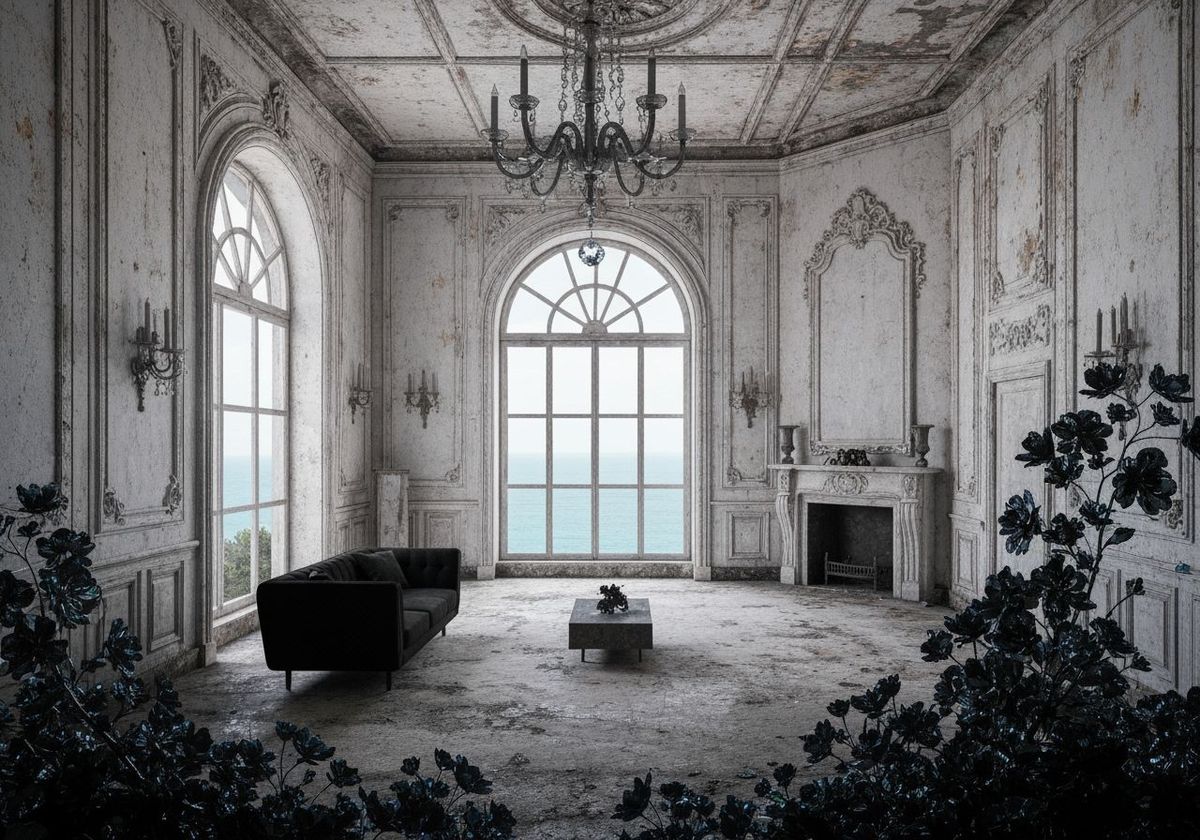 A highly detailed, photorealistic image of an ancient, dusty vintage room. Features distressed white walls, a large arched window with an ocean view, sofas, fireplace, and a shimmering chandelier.
