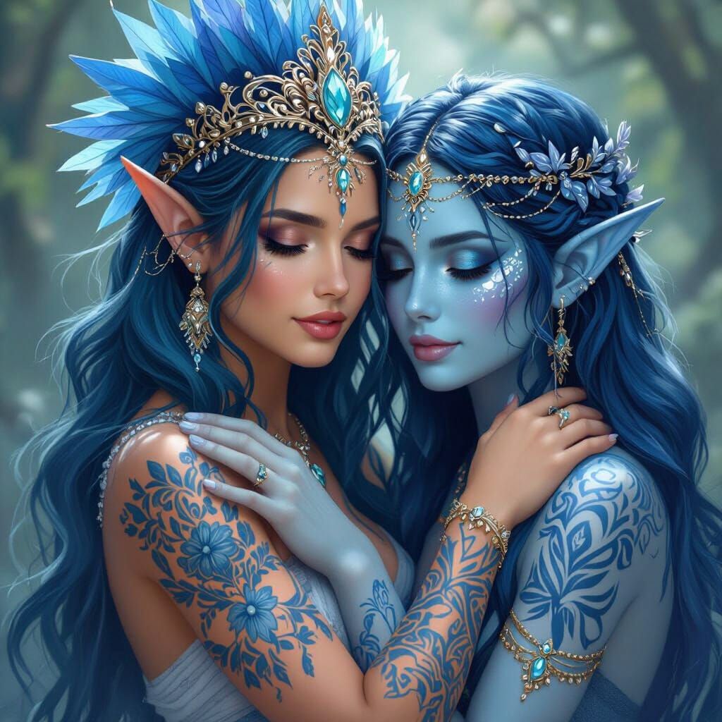 This image shows two blue goddesses in a loving embrace. One goddess wears a regal headdress and ornate tattoos, creating a visually striking fantasy scene.