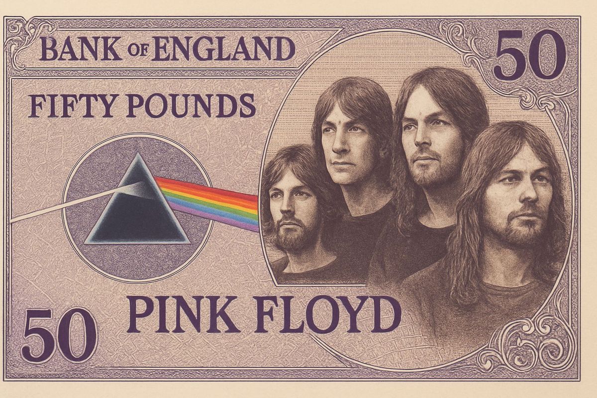 A vibrant image of a fictional British banknote. The artwork showcases a tribute to Pink Floyd, rendered with detailed and colorful psychedelic elements.