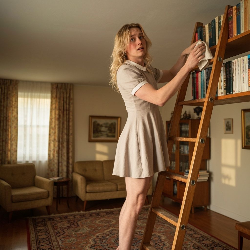 This image shows a 19-year-old with long blonde hair cross-dressing in a vintage style dress while standing on a ladder. The candid shot captures a vulnerable and playful moment bathed in warm sunlight.