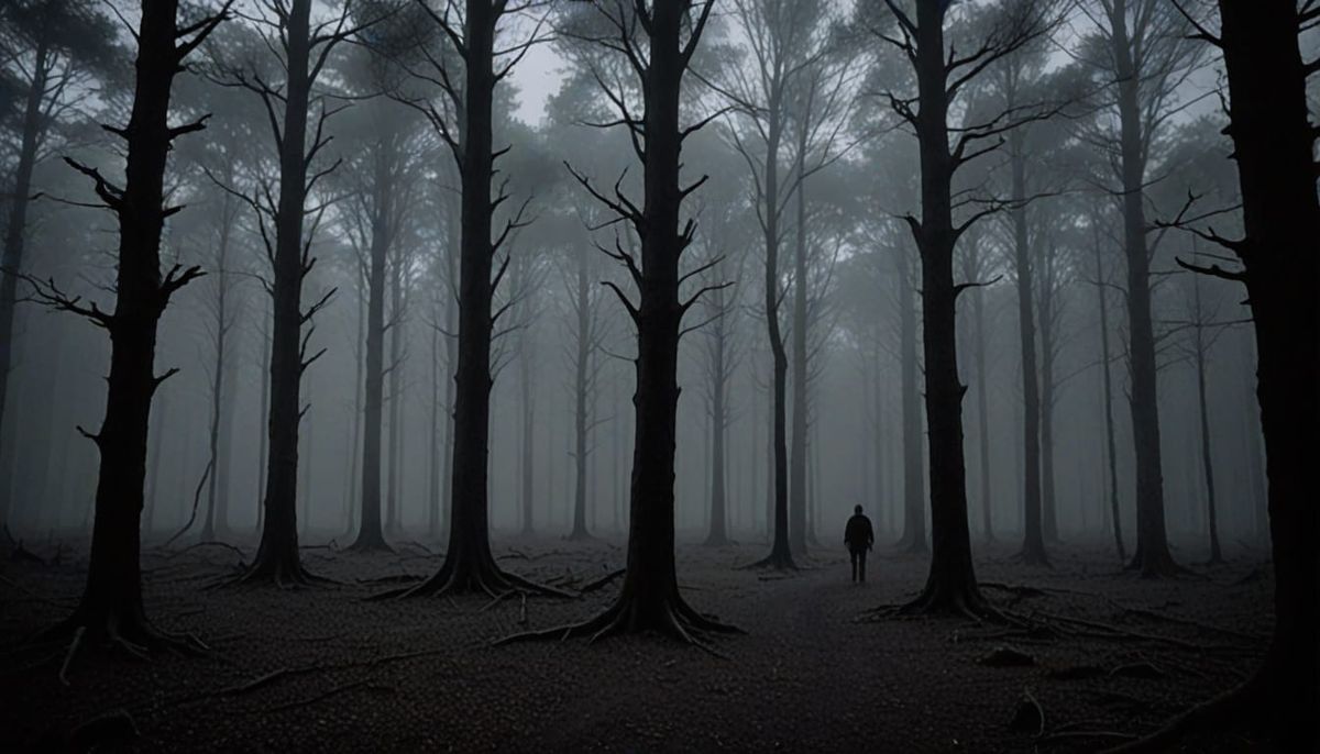 This image depicts a suspenseful scene in Rendlesham Forest, England. Men in black investigate mysterious lights and shadowy figures amidst a cinematic, eerie sci-fi atmosphere with subtle alien hints.