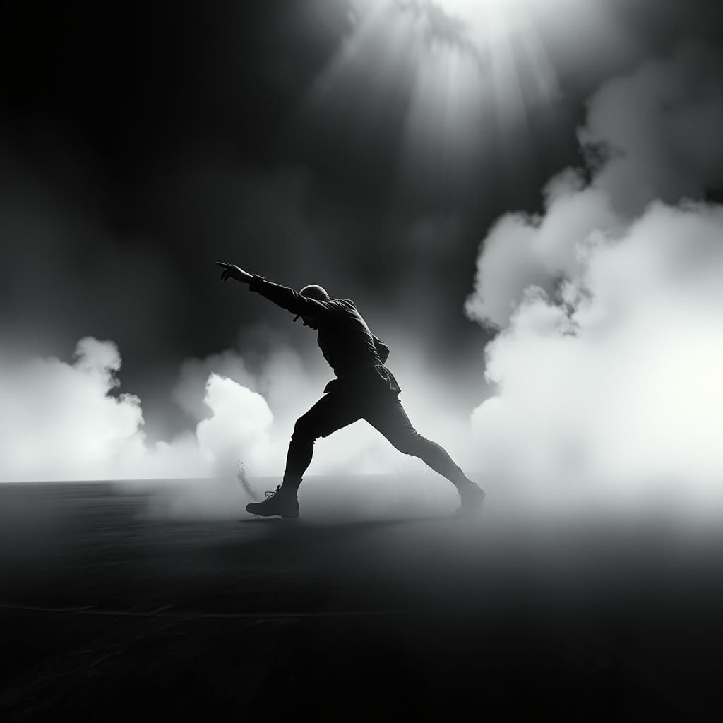 A dramatic scene of a lone figure in a state of intense energy, captured in hyperrealistic detail with moody tension and cinematic lighting, evoking a sense of grandeur and perfection in composition.