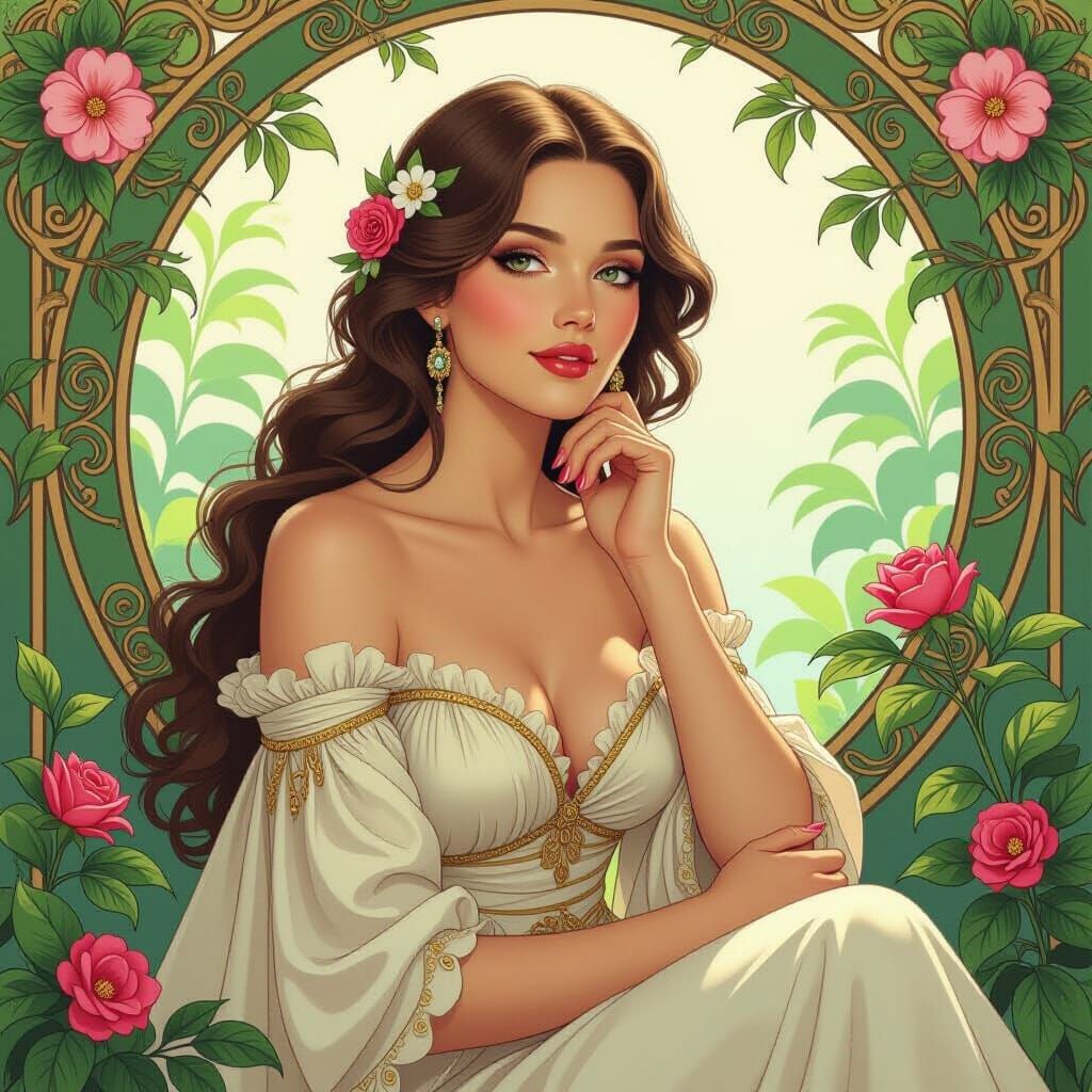 A beautiful woman in luxurious clothing is surrounded by plants and flowers. The artwork has elements reminiscent of art nouveau and digital painting styles.