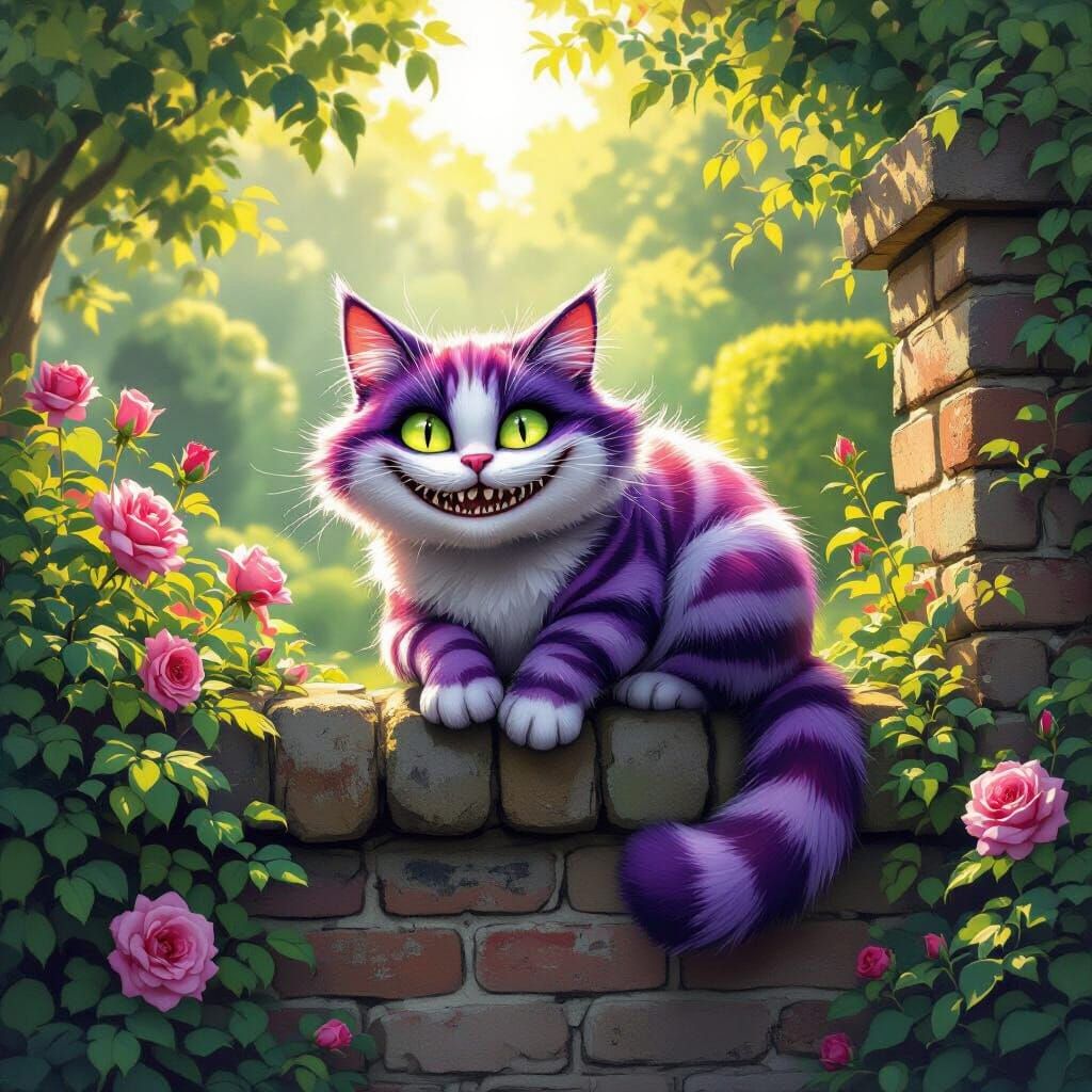 This image shows a playful Cheshire Cat with purple and pink fur on an English garden wall. Rendered in a whimsical, illustrative style with warm, golden light.
