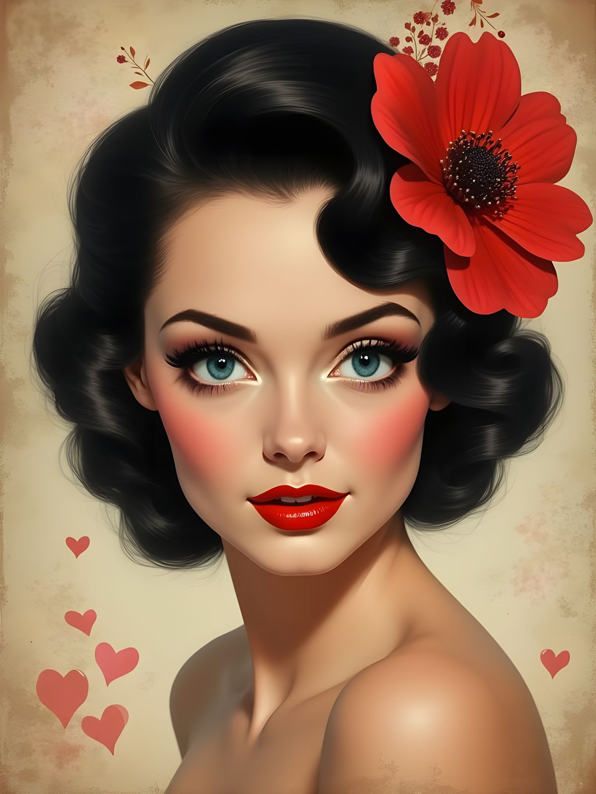 This image showcases a glamorous woman with classic, vintage Hollywood beauty, featuring striking blue eyes, bold red lips, and soft skin, set against a nostalgic, parchment-like background with subtle details.