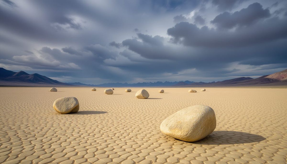 This image captures the iconic moving stones of Racetrack Playa, USA, beneath a dramatic cloudy sky. It features deep shadows and vibrant earth tones, rendered with precise textures.