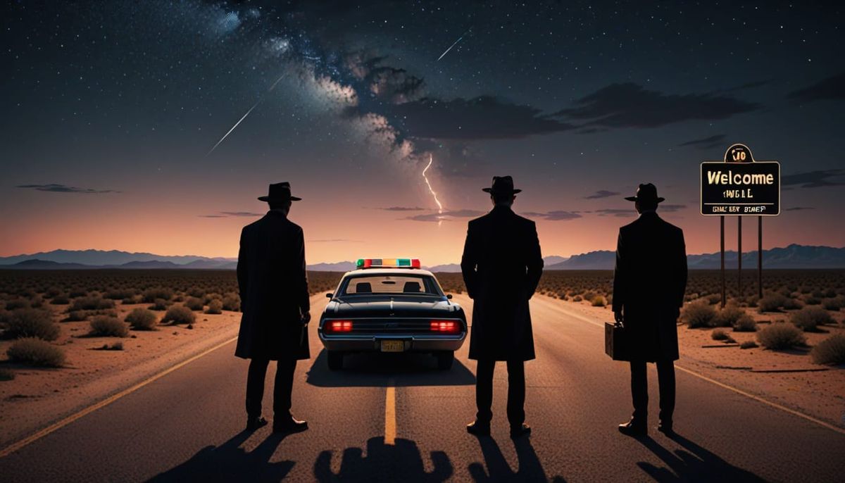 This image shows two Men in Black standing before the Roswell sign as lightning illuminates the night sky. One holds a glowing briefcase, creating a cinematic and moody scene.